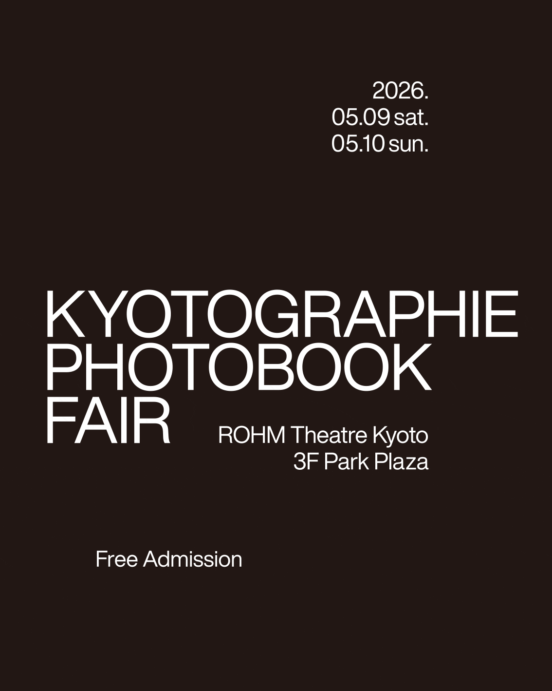 Launched in 2021 as part of KG+, the satellite event of the KYOTOGRAPHIE International Photography Festival, the event has grown into a key platform for photobook publishers. In 2025, it welcomed over 30 exhibitors from 8 countries, reflecting its expanding international reach and growing relevance. The Photobook Fair becomes an official KYOTOGRAPHIE event in 2026.