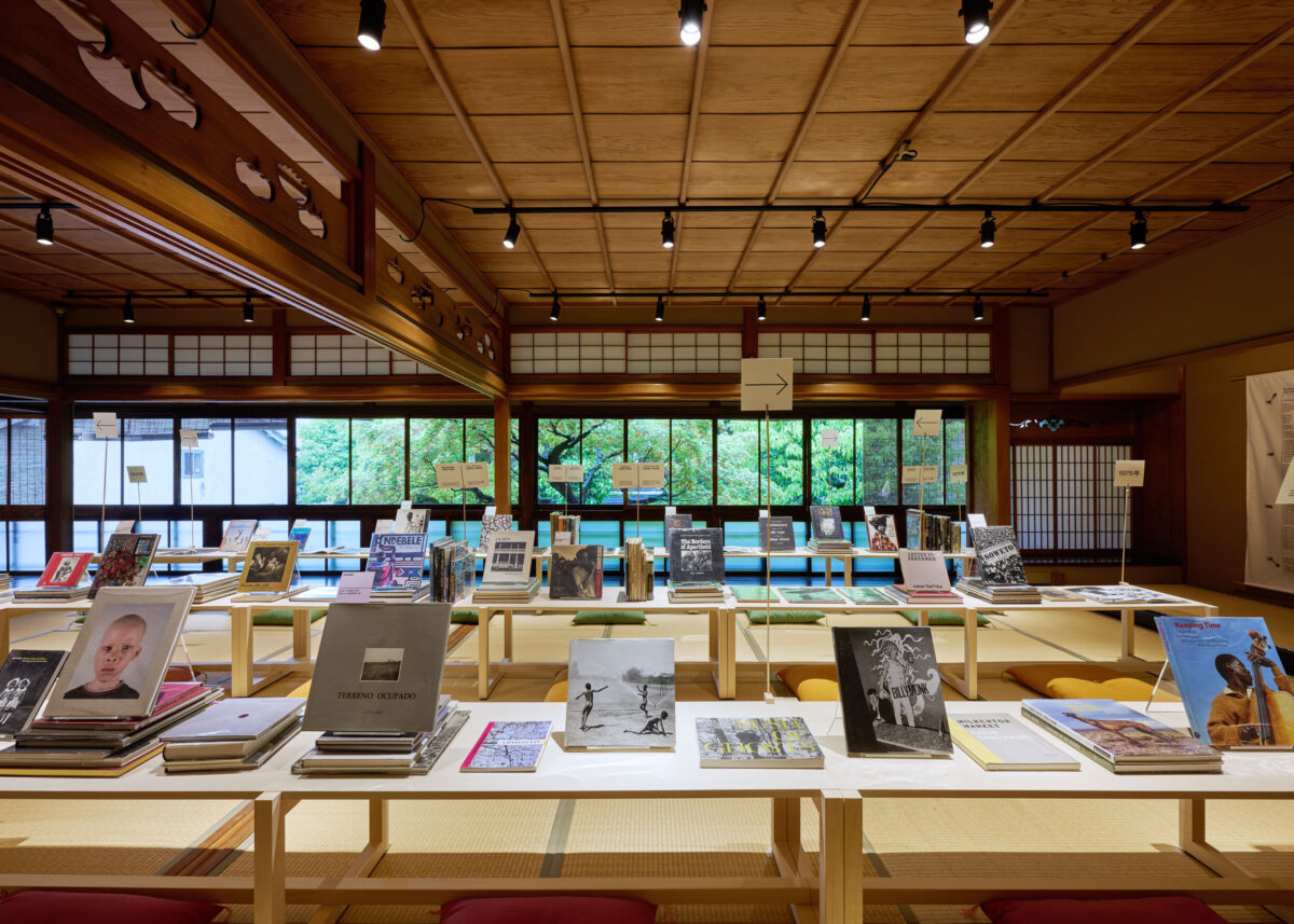 The books here on the second floor of Kyoto’s Hachiku-an (former Kawasaki residence) are also chronologically displayed in a timeline, albeit across three tables. This timeline presents evidence of the beginnings of a cosmopolitan book culture during the politically charged years of high apartheid years (1948–94), when state repression and censorship ensnared even photobooks. It also includes abundant examples of innovation in photography and book design in the democratic years that followed (1994–present).